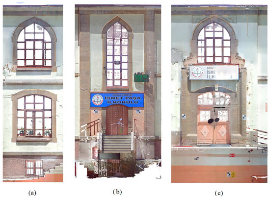 Orthophotos acquired from the point cloud with As-Built software: (a) windows; (b) back door and vertical window; and (c) front door and window.