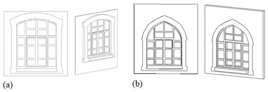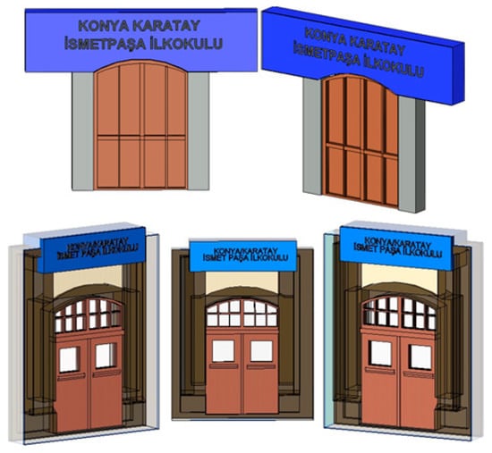 For the creation of door and window objects within the scope of the building, As-Built 2022 software generated orthophotos of the building façades; accordingly, adding two doors and four windows individually confined the building’s door and window drawings. Subsequently, the 3D depth details were prepared from the point cloud. Thanks to Revit and As-Built 2022 software, the door and window objects were created and saved in the Revit family library. Thus, these objects were stored to be used again in case of need at later necessary stages. Therefore, this step finalized the creation of the LOD300-level design. As-Built 2022 software potentially enables the design of semi-automatic objects throughout the object construction process, and the program may also localize the position of the window or door objects. However, since the details of the building are unique to this structure and do not contain the object characteristics saved in the library, a window or door object could not be created automatically []. Therefore, this study utilized a manual method while designing the building-specific object details. Figure 9 displays orthophotos of the window and door objects acquired from the point cloud. However, the study created the drawing over the orthophoto of the window object in Figure 10 following applicable commands of the Revit program. Afterward, the depth was assigned referencing the point cloud. The building’s vertical window object and the window on the ground floor both underwent identical procedures. Then, material preferences were made for the window and door objects by referencing the original designs of the building objects. They were attached to the model after saving it in the main library. Figure 11 displays the final versions of these items representing finalized and saved drawings and material assignments in the object library. Figure 12, however, depicts the appearance of the objects attached to the 3D model.