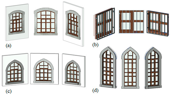 The final versions of the created window object saved in the family library. Window types for (a) level 2; (b) level 1; (c) level 3; and (d) level 2–level 3.