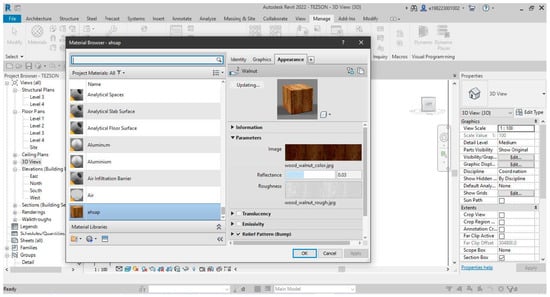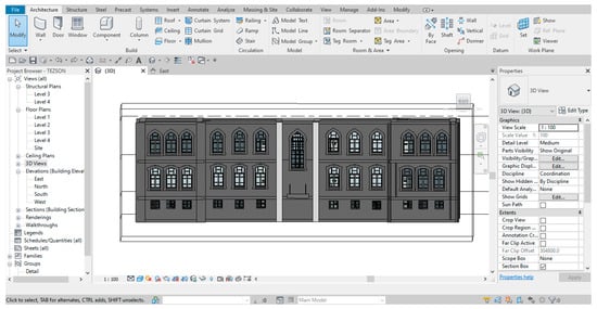 Subsequently, the material selection process ensued for the model created among available databases in the Revit library. For this step, proper materials in the Revit library were used Figure 18. For instance, a wooden model was chosen for the window, a stone model was chosen for the wall, or an iron material was chosen for the railing object. The outcomes of all these steps led to the creation of floor plans, building details, façades, and 3D models of the building. Figure 19 represents the final version.