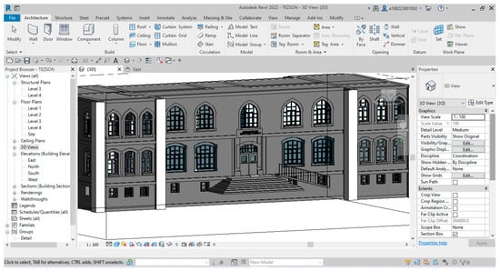 Building Information Modeling (BIM) is the running process of a digital model representing a building’s physical and functional features [,,,,]. The primary intent of BIM technology is to enable better construction in light of science, technology, and innovation [,,,]. In addition, BIM technologies are also used in planning, design, operation, and maintenance processes. Especially for maintenance work, BIM provides the necessary information and documents to the project stakeholders [,,,,]. BIM generates novel working perspectives and visual environments in architecture and restoration. The first step of this process, which refers to constructing a structure or an entity twice, is to create the building in the virtual background, while the second step covers building it physically on the site. The first stage comprises updating the 3D model of a construct with the relevant details and information and performing various analyses. Hence, this step addresses numerous potent issues through the virtual model, which provides practical convenience and advantages for the actual building construction on site [,]. BIM technology is a groundbreaking approach and improves the effectiveness of the process. It also sustains quality control, minimizes the time spent, and aims to avoid budget excess while constructing new buildings [,,]. It is possible to employ diversified approaches and software to model structures within the scope of BIM. In the BIM technique, there are various item-based parametric models for constructions. These items usually include fundamental construction elements such as walls, floors, ceilings, windows, doors, and columns. Although the objects are predetermined, users are reluctant to modify, personalize, or use them directly. The items in question fall under the category of parametric functions. Such a categorization makes it simpler to supply the relevant standards and streamline application processes. Saving several object classes in libraries increases accessibility and facilitates application processes [,,,,].