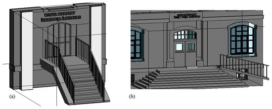 The building’s staircase objects were created by executing the stair instructions in the Revit software. For the ladder drawings, the graphic was made directly on the point cloud. The railing command for the railing detail and the ramp command for the school entry ramp created accurate images. Figure 15 displays the detailed perspectives attached to the 3D model.