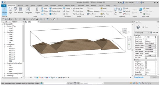 The building roof, one of the essential parts of a building, is composed of many physical roof kinds. The shape of the roof varies from region to region, depending on the construction style. Especially intricate structures may retain more than one roof. In essence, the roof structure in this study is in the traditional hip roof design. As a result, the Basic Roof Generic 400 mm family type object was selected as the building roof object (Figure 16). Figure 17 displays attaching the roof object to the model.