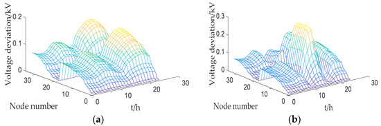 Figure 4. Voltage deviation curves: (a) before high proportion PV grid connection; and (b) after high proportion PV grid connection.