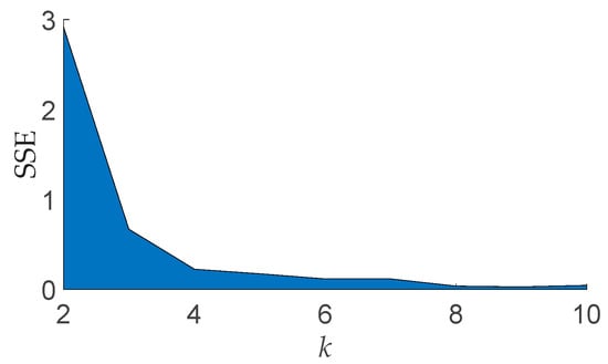 The selection of a k value is very important. This paper adopts the elbow rule to realize the selection of the k value. With the increase of cluster number k, the sum of squared errors (SSE) will also change, and the elbow rule is used to determine the optimal cluster number through the change trend of SSE [15]. SSE refers to the sum of squares of the distances from each data point to the center of its cluster, and its calculation formula is shown in Equation (3):