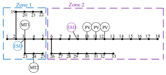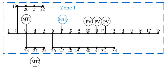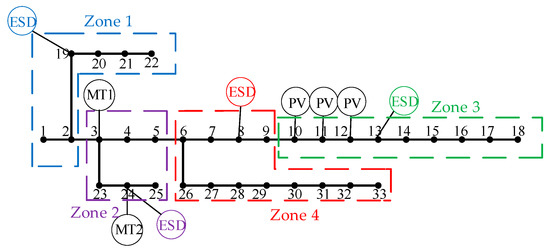 Micro turbines (MT) and a large number of PVs are connected to the DNVR model, and a distributed ESD is connected to stabilize the fluctuation [18]. In this paper, the regulation objective function is established from four aspects: reducing total voltage deviation, reducing total power loss, reducing economic cost and reducing the ESD installation ratio so as to realize DNVR with a high proportion of PVs, thus improving the economy and stability of the distribution network.