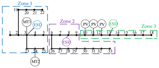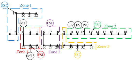 For comparative analysis, the nodes are grouped into 1, 2, 3 and 5 categories by using the k-means algorithm to determine 1, 2, 3 and 5 zones, respectively, and the ESD is also connected to the cluster center, respectively. See Figure 7, Figure 8, Figure 9 and Figure 10 for the system diagram.