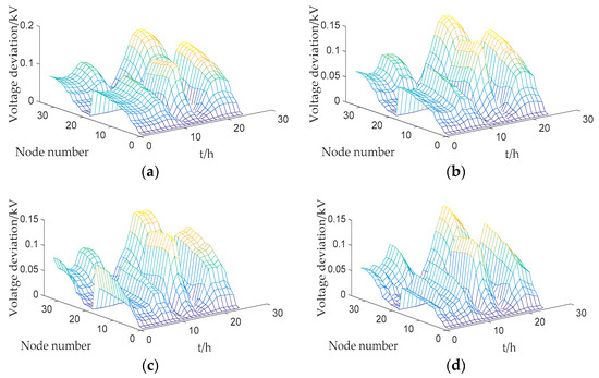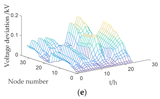 Figure 13. Voltage deviation results under various schemes (a) scheme 1; (b) scheme 2; (c) scheme 3; (d) scheme 4; (e) scheme 5.