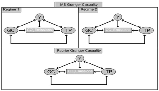 When the causality results in the context of natural gas consumption and environmental pollution were compared, the causality direction for the results in the first regime of the MS-GC model was different from that in the second regime and Fourier causality (FGC). In the second regime of the MS-GC model and in FGC model, a bidirectional causality result was determined, whereas unidirectional causality from GC to environmental pollution was found for the first regime in the MS-GC model. In the MS-GC model, unidirectional causality from Industry 4.0 to environmental pollution was found in both regimes and the FGC model. Industry 4.0 was the Granger cause of environmental pollution. In the context of the coefficient signs of the variables, the negative sign of the variables at lag(−2) in regime 2 and in FVAR model showed the positive impact of tp on environmental pollution. Industry 4.0 was also a variable with positive effects on economic growth at lag(−1) in all models. The evidence of bi-directional causality among the variables was found between the variables in both regimes in the MS-GC model and FGC model. Industry 4.0 was an important variable in both environmental pollution and economic growth.
