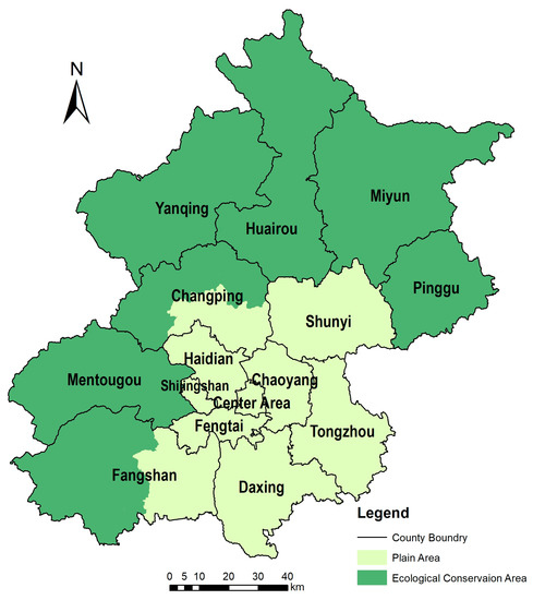 The Beijing ecological conservation areas (115°25′–117°30′ E, 39°30′–41°40′ N) are located in the north and west of Beijing, with a total area of 11,176.22 km2. The area contains 7 administrative divisions, namely, the Mentougou District, Pinggu District, Huairou District, Miyun District, and Yanqing District, and the mountainous areas in the Changping District and Fangshan District (Figure 2). The area experiences a warm, temperate, semi-humid, continental monsoon climate with hot summers, cold winters, and the same periods of rain and heat. The terrain is higher in the north and lower in the south, and 80% of the forest resources, 60% of the water resources, and 65% of the wetlands in Beijing are located in the study region. The main mountain ranges are the Xishan, Yanshan, and Jundu Mountains. In addition, the Yongding River and Chaobai River flow through the protected areas. The vegetation types in the territory are represented by warm temperate deciduous broad-leaved forests with temperate coniferous forests.