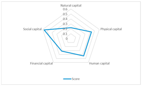 Based on the TOPSIS evaluation, the closeness degree was ranked and graded using the following classifications: grade 1 (0, 0.2), grade 2 [0.2, 0.4), grade 3 [0.4, 0.6), grade 4 [0.6, 0.8), and grade 5 [0.8, 1.0); these represented the livelihood sustainability index from low to high. As shown in Table 4, the lowest score of the farmland area in natural capital was 0.1154; the highest score of the road condition in social capital was 0.8467, with an average of 0.4436, indicating that the overall livelihood sustainability of rural households in the ecological conservation area was at a medium level. In addition, as shown in Figure 3, the weighted average of the five types of livelihood capital was calculated according to the weights and scores of indicators. Social capital (0.5691) was relatively high, followed by human capital and physical capital (0.4342); financial capital (0.3136) and natural capital (0.2225) were relatively low.