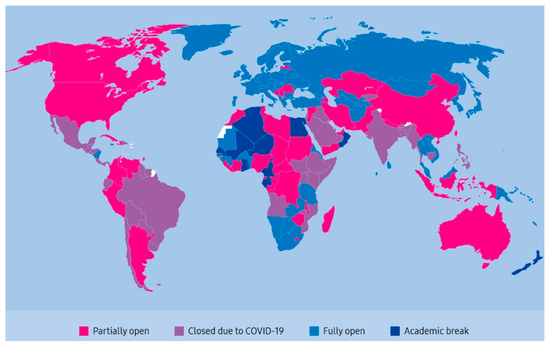 In the past three years, numerous nations and territories have temporarily shuttered their schools in reaction to the COVID-19 pandemic [1,2,3]. Due to the global wave of pandemic lockdowns, there was an unprecedented rise in online learning. As of 1 April 2022, nearly 1.5 billion children in 173 countries were affected by school closures, as shown in Figure 1. In Denmark, children up to the age of 11 are returning to nurseries and schools after initially closing on 12 March 2022, but in South Korea students are responding to roll calls from their teachers online. In China, the largest “online movement” in the history of education occurred in mid-February 2022 after the government instructed a quarter of a billion full-time students to resume their studied online [4,5,6]. As a result, education has changed dramatically, with the distinctive rise of online learning, whereby teaching is undertaken remotely and on digital platforms. Fernando et al. [7] analyzed the opportunities and challenges of emergency remote teaching based on experiences of the COVID-19 emergency, and a qualitative research method was undertaken in two steps. Based on the lessons learned from this worldwide emergency, challenges and proposals for action to face these same challenges, which should be and sometimes have been implemented, were provided. Octavian and Nicoleta [8] carried out a comparative scientific research regarding the students’ perception of e-learning platforms and tools based on 144 respondents from Romania and the Republic of Moldova. Mohammed et al. [9] contributed to the body of knowledge on educational technologies adoption during COVID-19 by providing a comprehensive model that captures the most significant determinants of Madrasati platform adoption among Saudi public schools.