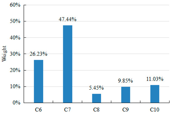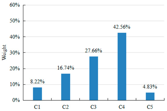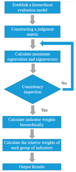 In Equation (2), λmax is the maximum eigenvalue of the judgment matrix R, and W is the corresponding normalized eigenvector. Then, the weight values of each factor in the AHP evaluation model can be obtained through Equations (3)–(5).