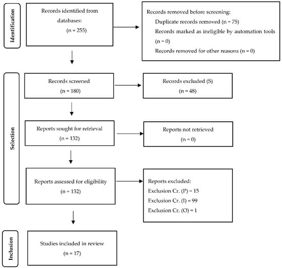 75 of the 255 records initially retrieved from the databases were duplicates or triplicates. As a result, 180 articles in total were downloaded. Forty-eight studies were disregarded in accordance with criterion 5 (Study) after the titles, abstracts, and full texts of the remaining publications were examined in accordance with the same criteria. Out of the 132 articles that were left, 15 were eliminated for failing to meet Criterion 1 (Population), 99 were eliminated based on Criterion 2 (Intervention), and one was eliminated based on Criterion 3 (Outcomes). Finally, for the qualitative analysis, 17 studies were included (Figure 1).