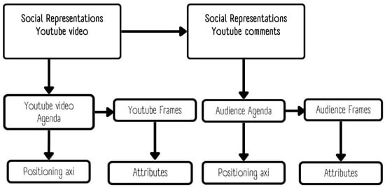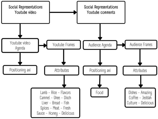 Through the mixed analysis program, Atlast.ti8, the transcriptions of the seven videos by Mark Wiens and the three by Trebor James on his channel, The Food Ranger, were analyzed to know the representation of the image that represented the gastronomy of Saudi Arabia on their respective channels. It is worth noting that on YouTube, it is possible to obtain transcripts of videos and read them if required. The 10 videos together had 10,836,352 views. With Atlas.ti8, all the comments of the 10 videos were analyzed, which in total, as of 18 March, the day the data were collected, was 16,327. Said data were also processed through the Atlast.ti8 program to know the understanding of the image of the gastronomy of Saudi Arabia for the subscribers. The data were analyzed considering the theory of social representation, the agenda, and the framing (see Figure 1).