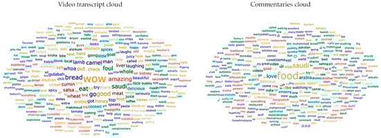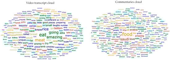Figure 8 shows us the analysis of the video transcriptions and viewer comments on World’s CRISPIEST Lamb!! King of MEAT & HONEY in Jeddah, Saudi Arabia! []. The cloud transcription represents the image of Saudi Gastronomy through ”media frames” and it shows the effect in the cloud commentaries. The most important media frames that let us know some positioning attributes that build the representation of the image of the destination Saudi Arabia appear to be Lamb, eat, flavor, food, Saudi, Arabia, sauce, and honey. As a most important “audience frames” appear food, lamb, Saudi, Arabia, delicious, honey, amazing, and Jeddah. The comparison lets us know the influence of this video on the audience.