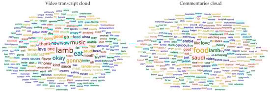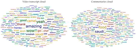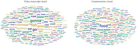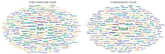 Figure 6 shows us the results of Mark Wiens’s video: Street Food + SEAFOOD in Saudi Arabia!! SA Best RED SEA Fish and Shrimp in Jeddah!! []. The cloud transcription represents the image of Saudi Gastronomy through the “media frames” and it shows the effect in the cloud commentaries. The most important media frames that let us to know some positioning attributes that build the representation of the image of the destination Saudi Arabia appear to be fish, eat, good, fresh, food, sea, spices, try, and sauce. The most important “audience frames” appear to be food, Arabia, Saudi, Arabia, Jeddah, visit, country, and yummy. The comparison lets us know the influence of this video on the audience.