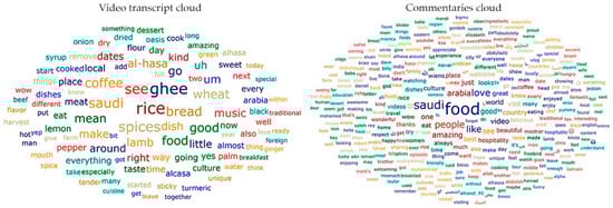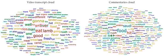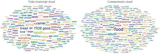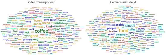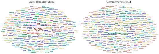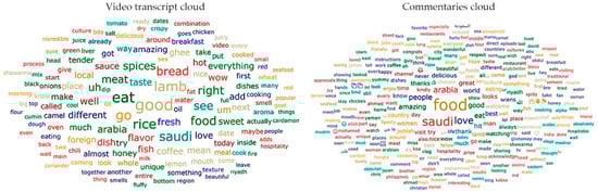 Figure 9 shows us the results of the video transcriptions and viewer comments on Better Than GOLD!! Rare ARABIAN FOOD in World’s Biggest Oasis—2 Million Palm Trees! []. The cloud transcription represents the image of Saudi Gastronomy through the “media frames” and it shows the effect in the cloud commentaries. The most important media frames that let us know some positioning attributes that build the representation of the image of the destination Saudi Arabia appear to be rice, bread, ghee, spice, dish, food, good, lamb, coffee, and Saudi. The most important “audience frames” appear to be food, good, Saudi, Arabia, amazing, beautiful, culture, and eat. The comparison lets us know the influence of this video on the audience.