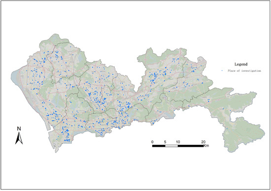 This research utilized the travel data of residents from the 2019 survey of traffic behavior and willingness of Shenzhen residents, which the Shenzhen Transportation Bureau and Shenzhen Urban Transport Planning Center Co. jointly organized. The resident study was stratified according to the number of administrative districts, streets, and community management and service populations. A total of about 11,000 households and 20,000 interviewees were effectively surveyed. Figure 1 shows the spatial location of the surveyed households. The questionnaire is divided into three parts: family characteristics, personal characteristics, and a travel chain survey. The travel chain data includes the origin and destination of the respondents, the distance, time, and mode of transportation of each journey.