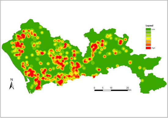 Table 1 lists the calculation results of the spatial autocorrelation of the car travel distance. The Z-scores exceed 2.58, indicating the statistical significance of the data. The p-value was less than 0.01, demonstrating that car dependence data had a positive spatial autocorrelation (Moran’s I > 0). Figure 2 shows the spatial distribution of the travel distance of residents’ cars. From red to green, the travel distance of residents decreases in turn.