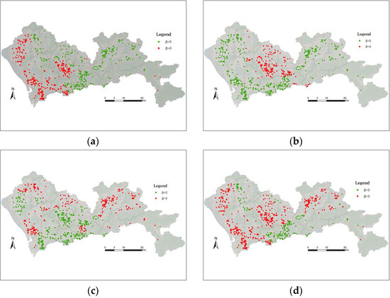 Spatial distribution of estimated coefficients. The red color indicates > 0 and the green indicates < 0. (a) F1 (land use mix). (b) F2 (population density). (c) F5 (metro station density). (d) F6 (road network density).