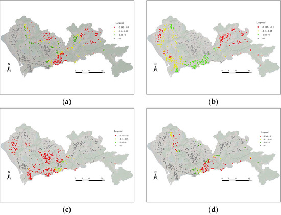 Figure 3 shows the spatial distribution of the estimated coefficients. The red residential area indicates that the estimated benefits of the built environment are positive ( > 0). In contrast, the green residential area suggests that the estimated benefits of the built environment are negative ( < 0). As depicted in Figure 3a, when residence communities are from west to east, the estimated coefficient of the land use mix changes from positive to negative, which indicates that the correlation between land use mix and resident car dependence varies from positive to negative. Figure 3b shows that the population density in the central region promotes the support of residents for cars, while the other areas have the opposite effect. Figure 3c demonstrates that, in addition to the suburbs, the improvement of metro station density can effectively reduce the use of cars by residents. Figure 3d shows that increasing road network density will lead to more dependence on vehicles in areas other than the urban center and Guangming New Area.