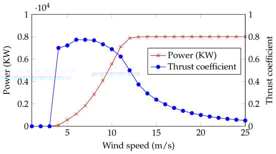 To determine the energy production of a wind farm, it is necessary to evaluate the reduction in the wind speed caused by upstream WTs on downstream turbines. The reduction in the wind speed due to the wake effect from upstream WTs is related to the thrust coefficient, , of the upstream turbine. The thrust coefficient, also referred to as the drag coefficient, demonstrates a significant decrease as the wind speed increases, as depicted in Figure 1. The power output of a single WT is determined by its power curve, but for an array of WTs, the wake effects and power output are mainly determined by the thrust coefficient curve [31]. Figure 1 gives the power curve and the thrust coefficient of the WT used in this study.