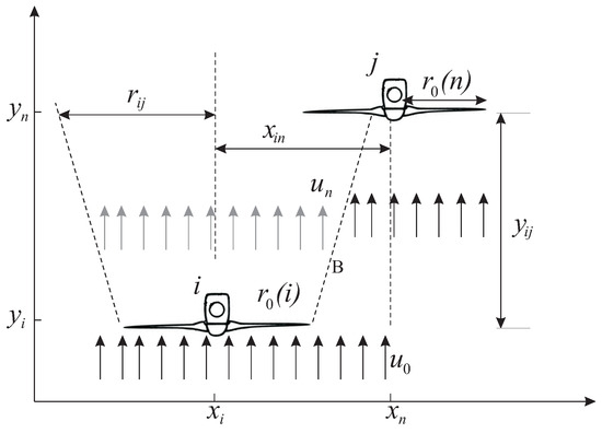 The wake effect between two turbines is illustrated in Figure 2. The upstream turbine i and the downstream turbine j are located at coordinates and , respectively. The wake effect is axisymmetric, and its intensity is dependent on the distance between the two turbines and the wind direction, as illustrated by the dashed line B and the wake radius . The wind speed at the downstream turbine j, , is determined by: