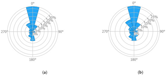 The wind resource at a particular location can be characterised by analysing the wind speed and direction data, known as wind knowledge. This information is critical in determining the dominant wind directions, which is essential in designing the WF configuration to minimise the wake effects and maximise energy production [32]. Using wind rose data, each wind direction can be associated with the Rayleigh distribution, estimating the wind distribution throughout the year. The inclusion of wind directions in the AEP leads to Equation (6), where represents the wind direction in degrees [31] and k ranges in [] in k degrees.