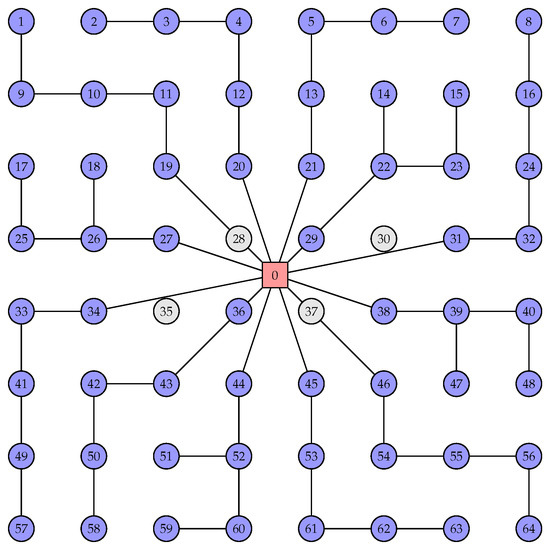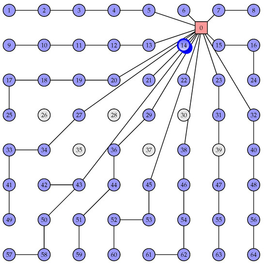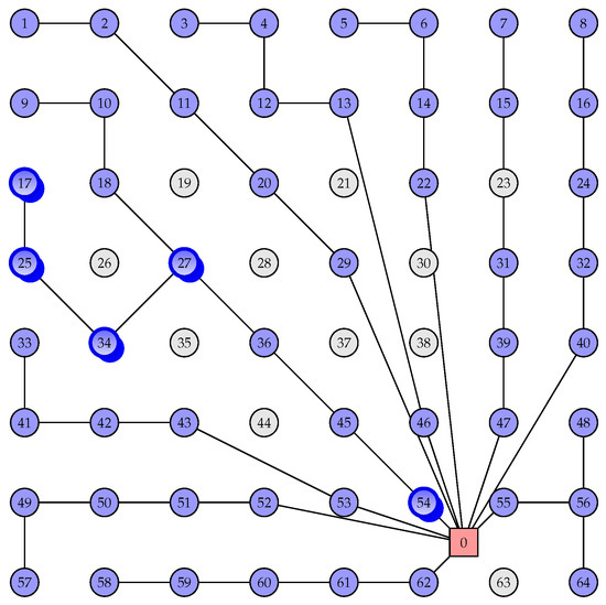 The goal was to determine the set of locations to install WTs and, simultaneously, find the WF connection layout, i.e., a spanning tree of a graph with , and , the substation node being the root of the spanning tree. The substation will be connected directly to turbines by several cables. Each of these cables will connect some WTs, which in turn will be connected to other WTs. A set of WTs connected to each other by a cable coming from the substation and its connections is called a branch line. Usually, these turbines are connected in series.