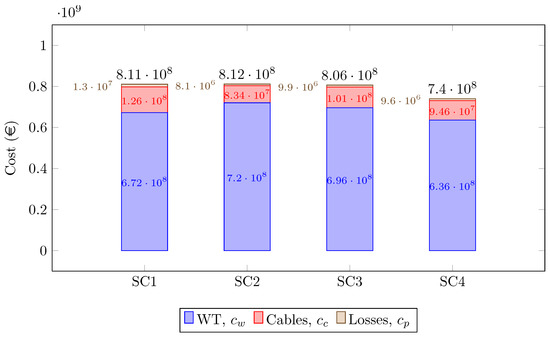 The net profit is the difference between the revenues and the total costs. As revenues, we have the income from the sale of energy. The amount sold is the energy generated minus the active losses in the energy transmission process during the expected wind farm lifetime. Therefore, we can consider as costs the sum of the WT costs, , the cable cost, , and active losses costs, , and as income received from the sale of all the energy generated by the WTs, , during the wind farm lifetime.