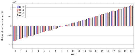 Figure 15 illustrates the amortisation over the lifetime of the project. It is possible to analyse the return on investment over the OWF’s lifetime, which is 20 years. In Scenarios CS1, CS2, and CS3 the return on investment was from the ninth year on, while in Scenario SC4, the return on investment began in the eighth year.
