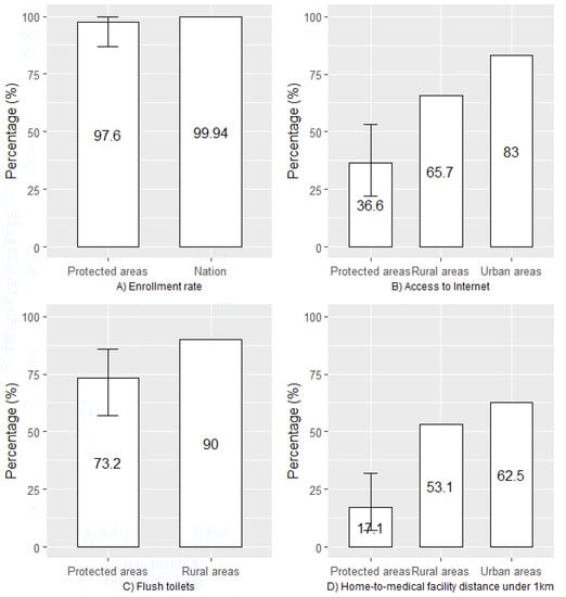 Comparisons between protected areas and other areas in terms of four indexes: (A) the enrollment rate in protected areas is lower than that in the nation (p < 0.05); (B) the percentage of access to the Internet in primary schools in protected areas (PSPAs) is lower than that in rural and urban areas (p < 0.01); (C) the percentage of PSPAs with flush toilets is lower than that in rural areas (p < 0.01); and (D) the percentage of PSPAs where students have a home-to-medical facility distance under 1 km is lower than that in rural and urban areas (p < 0.01).