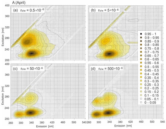 The accuracy of oil determination in seawater can be affected by natural biological activity, which can result in overlapping fluorescence signals between natural seawater components and oil [47]. To address this issue, this study examined the impact of biological activity on oil fluorescence in seawater as reflected in the EEM spectra over the course of a year. The current study analyzed the use of a mixture of oils to contaminate seawater for ro/w ratios in the range of 0.5–500 × 10−6. In Figure 5A,B, the EEM spectra of seawater contaminated by the mixture of oils for two selected months, April (A) and December (B), with varying levels of biological activity throughout the year (ro/w = 0.5 × 10−6, 5 × 10−6, 50 × 10−6, and 500 × 10−6) were presented. The EEM spectra of seawater contaminated with the oil mixture in the range of ro/w used in this study were significantly different from those of natural seawater. This analysis aimed to investigate the influence of oil present in seawater on changes in EEMs.