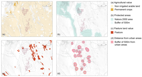 The first step was the definition of the siting criteria according to the values derived from studies in the literature. Starting from a long list of more than forty sustainability criteria collected from studies, such as [3,55], eight criteria were selected for the case study (i.e., agricultural values, distance from protected areas, pastureland value, distance from urban areas, integration with existing infrastructures, distance from archeological sites, visibility from the streets, and visibility from touristic routes). The criteria excluded technical constraints, such as terrain suitability and access to power grid, considering environmental, social, and economic issues. The second step was the selection of the four most significant criteria as perceived by the respondents from the answers of Q2.4. These were then made spatially explicit using georeferenced data derived from public databases, as reported in Table 2. Each policy aspect was scored on a 3-point scale as being “possible”, “intermediate”, or “sensitive”, underlying the level of mitigation action required.