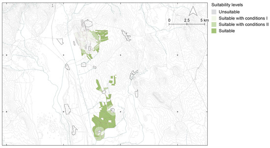 Considering the sensitive areas that are unsuitable and, subsequently, excluded, this would lead to a substantial reduction in the available surface area. Thus, embracing a landscape-integration approach, the areas were divided between “nonsuitable”, “suitable under condition”, and “suitable”. The conditions represent mitigation actions, such as modifications to the physical appearance of the solar farm. Overlapping the four criteria, the scores of each area were summed. Specifically, to support this process, a suitability scale was created defining the thresholds for the levels of suitability, considering the possibility that some siting criteria can overlap. Specifically, summing the points assigned to each siting criteria, according to Table 3, a sum of zero points represents suitable locations, of one point suitable locations with conditions, of two points suitable locations with restricted conditions, and more than two points nonsuitable locations. The result is a map showing the levels of suitability for solar site selection as perceived by the inhabitants (Figure 6).