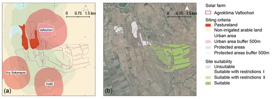 Spatialization of the results in the solar farm Agroktima Vafiochori: (a) most critical siting criteria; (b) suitability levels according to the opinion of the inhabitants.