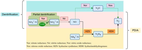 Schematic illustration of the denitrification process, including the partial denitrification-anammox (PD/A) process steps.