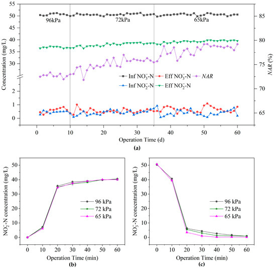 NH4+-N, NO2−-N and NO3−-N concentrations of SBR-A are presented in Figure 6 at 96 kPa (Figure 6a), 72 kPa (Figure 6b), 65 kPa (Figure 6c). The lower the air pressure, the lower the concentrations of NH4+-N and NO2−-N in the effluent, while the NO3−-N concentrations increased. Compared with those at 96 kPa, the NH4+-N and NO2−-N concentrations in the effluent at 65 kPa were lower by 45% and 56%, while the NO3−-N concentration was greater by 3%.