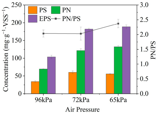 To assemble and withstand adverse environmental conditions, bacteria require EPS, a marker of microbial activity [17]. At the end of each air pressure phase in the reactors (i.e., day 10, day 35, and day 60), samples were taken for EPS analysis in order to better understand how air pressure affects microbial activity during the PD process (Figure 4). The EPS content of the PD sludge was 103.8 mg/(g·VSS) at 96 kPa, and the EPS contents of the sludge at 72 kPa and 65 kPa were about 1.8 times that at 96 kPa. In addition, the PN/PS ratio for both the 96 kPa and 72 kPa air pressure was about 2.0, while for 65 kPa, it was 2.4. It can be assumed that the lower air pressure did increase the EPS content and change its composition. By facilitating full contact between bacteria and inorganic nutrients through adsorption and accumulation, the PS facilitated the conversion of NO3−-N to NO2−-N, which in turn promoted the PD process [11]. Although the PS content at 65 kPa was slightly lower than that at 72 kPa, it was also about 75% higher than at 96 kPa, which is not inconsistent with the NAE increasing with lower air pressure.