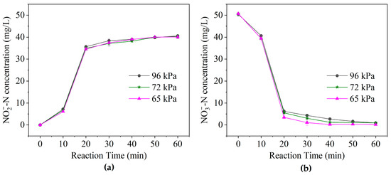 The concentration of (a) NO2−-N and (b) NO3−-N of PD batch tests at different air pressures, but with the same low DO concentration (≤0.05 mg/L).