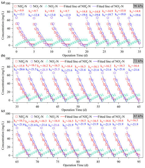 NH4+-N, NO2−-N and NO3−-N concentrations of SBR-A at 96 kPa (a), 72 kPa (b), and 65 kPa (c). kA—the slope of the NH4+-N concentration fitted line. kN—the slope of the NO2−-N concentration fitted line.