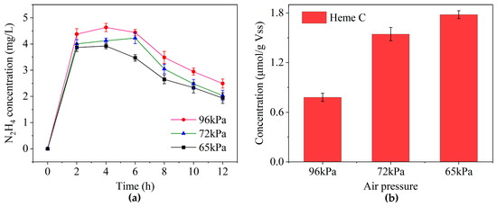 The heme C concentrations at 96 kPa, 72 kPa and 65 kPa were 0.8 μmol/(g·VSS), 1.5 μmol/(g·VSS), and 1.8 μmol/(g·VSS), respectively. At lower air pressures, the increase in sludge heme C concentration reflected an enhancement in anaerobic ammonia oxidation sludge activity (Figure 7b), indicating that low air pressure promoted the consumption of hydrazine, which was beneficial to the conversion of hydrazine to nitrogen, and finally promoted the anammox reaction. Previous research [11] has found that lower pressure is conducive to improving the activity of anammox bacteria, which is consistent with the results of this study.