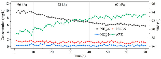 The nitrogen concentrations in the effluent during the stable operation of the reactor during Phase 96 kPa, 72 kPa and 65 kPa (i.e., day 10, day 40 and day 70) were taken for analysis. The NH4+-N concentrations in the effluent were 9.7 ± 0.3 mg/L (96 kPa), 7.8 ± 0.7 mg/L (72 kPa) and 6.2 ± 0.3 mg/L (65 kPa). The NO2−-N and NO3−-N concentrations varied little between the different air pressures, with a concentration range of about 0.15–0.3 mg/L and 0.9–1.8 mg/L, respectively.