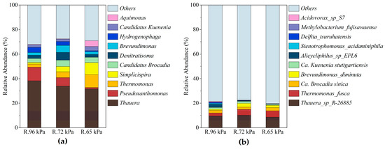 The relative abundance of microbial communities at the genus (a) and species (b) level in the sludge samples collected at different phases. R.96 kPa: sample from Phase 96 kPa (day 10); R.72 kPa: sample from Phase 72 kPa (day 40); R.65 kPa: sample from Phase 65 kPa (day 70).