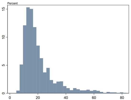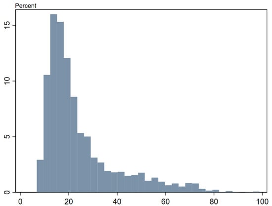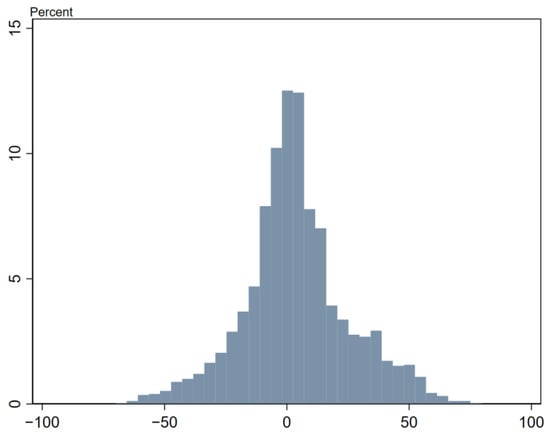 Figure 2, Figure 3 and Figure 4 show the distribution characteristics of the promotion, suppression and net effects of ESG responsibility on green innovation by industrial enterprises. From Figure 2 and Figure 3, it can be seen that the distributions of both the promoting and inhibiting effects of ESG compliance on green innovation show a right trailing feature, which indicates that only a small proportion of industrial enterprises’ green innovation is more sensitive to the fluctuation of ESG compliance. It is noteworthy that the impact of the inhibitory effect of ESG responsibility fulfillment disappears at around 82%; however, the impact of the promotion effect of ESG responsibility fulfillment still trails at 100%, which indicates that the promotion effect of ESG responsibility fulfillment of industrial enterprises has a greater impact on green innovation. The distribution characteristics of the net effect of ESG responsibility fulfillment in Figure 4 show that the net effect of the interaction of the inhibitory and facilitative effects of ESG responsibility fulfillment is significantly greater than zero. Statistical analysis shows that the net effect of ESG compliance on approximately more than 57% of the industrial enterprises in the sample is greater than zero, indicating that these enterprises effectively fulfill their ESG responsibilities and that the benefits derived from the significant resources invested by enterprises in ESG compliance feed into their green innovation activities. This also implies that no more than 43% of industrial enterprises fulfilling ESG responsibilities inhibit corporate green innovation. Figure 2, Figure 3 and Figure 4 show that the ESG compliance of Chinese industrial companies in general promotes the level of green innovation.