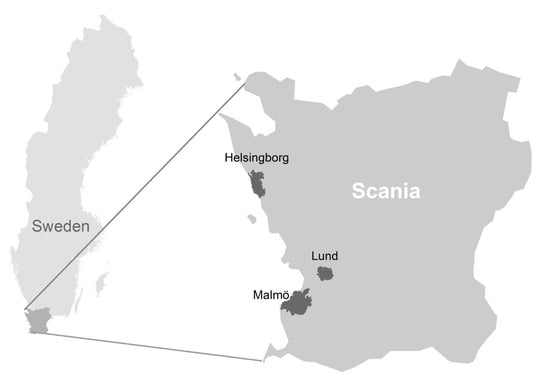 Malmö is the third largest city in Sweden with a population of approximately 357,000, located in the southernmost part of Scania. To the west and northwest, former brownfields are being rebuilt as residential areas. Malmö is surrounded by the most productive soils in Europe. The city expanded rapidly with high-rise residential projects in 1965–1975. Larger roads were constructed, acting as barriers for wildlife and insects. Though nick-named the “City of Parks” [28], Malmö contains among the lowest green space quota per inhabitant in Sweden [29,30]. With proximity to the waterfront, Malmö is susceptible to flooding during heavy rains and to rising sea levels. The initial comprehensive plan consisted of an urban development vision, where goals and priorities were emphasised, cut down to specific strategies that were thought to end up as directions for physical planning. Sections in the plan contained perspectives such as “providing housing”, “higher education, research and development”, “dense city”, “the bike city” “water resources and infrastructure for water”, and “climate adaptation” [31]. Since 2003, Malmö has also had a “green plan”, ramifying green structures in the city and specifying the qualities and contents of biotopes intended to be kept and developed. The green plan is intended as a basis for physical planning, in a similar manner as the strategies, but it is not legally binding [32].