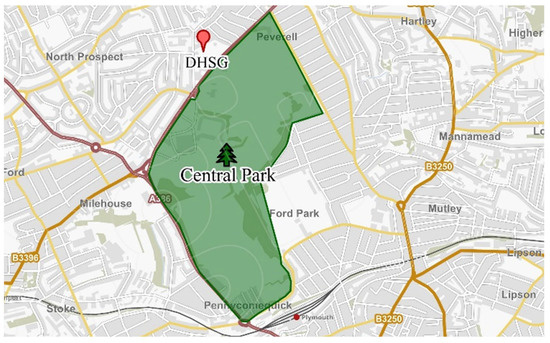 Plymouth is a waterfront city with more than 42% defined greenspace and is the biggest city in UK’s south-western peninsula [33]. Currently, half of Plymouth’s greenspaces fall below the quality thresholds, along with being under-used and under-valued [33,34]. In this context, the quality of the natural infrastructure in the city could continue to further decline, discouraging the people from using it while also simultaneously amplifying the reinstatement costs. These challenges around greenspace management and governance are common to other geographical areas. This research seeks to explore the application of the Living Lab approach in the project’s pilot site in Central Park in Plymouth (Figure 5), the biggest park in the city and originally created in 1928 to improve city resident’s health [35].