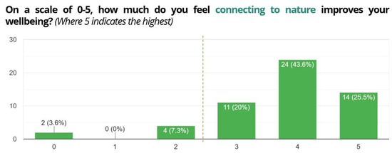 When asked how important they felt connecting to nature was to their wellbeing, the respondents (n = 55) exhibited a positive association between nature connection and wellbeing (Figure 4). Approximately 90% (n = 49) of those who responded rated the importance of nature for their wellbeing at a score of 3 or above on a 0–5 Likert scale, such that with 43.6% (n = 24) of responses were at a score of 4, followed by 25.5% (n = 14) at score of 5 and 20% (n = 11) at score of 3. Only two respondents felt that connecting to nature did not improve their wellbeing.