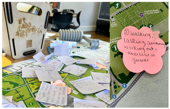 The participants were given an A2-sized map of Central Park and a selection of coloured Post-Its, and qualitative data were gathered in response to open-ended prompts to gauge the participants’ spatial awareness of the pilot site, their relationship with nature, their spatial relationship with the greenspaces in the park, and the usage patterns and barriers to engaging with these spaces. The responses were recorded in the form of rich qualitative data—texts and sketches by respective groups on Post-It notes and mapped in reference to different spaces on a map of Central Park (Figure 7). A deductive thematic coding (based on the theoretical framework) and further textual analysis were undertaken.